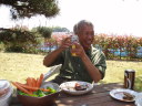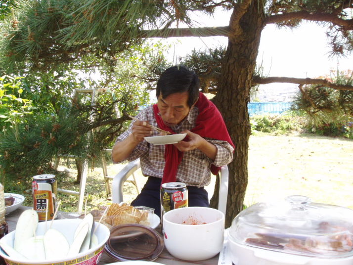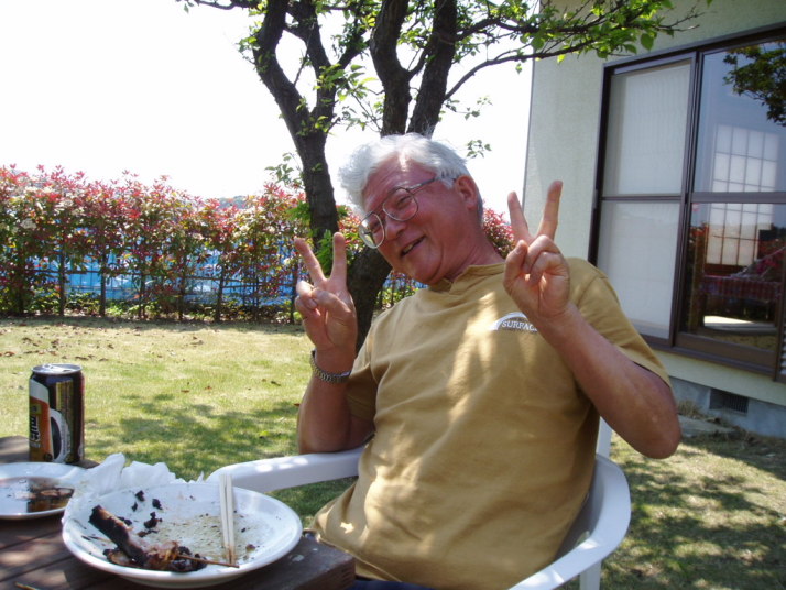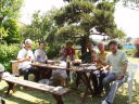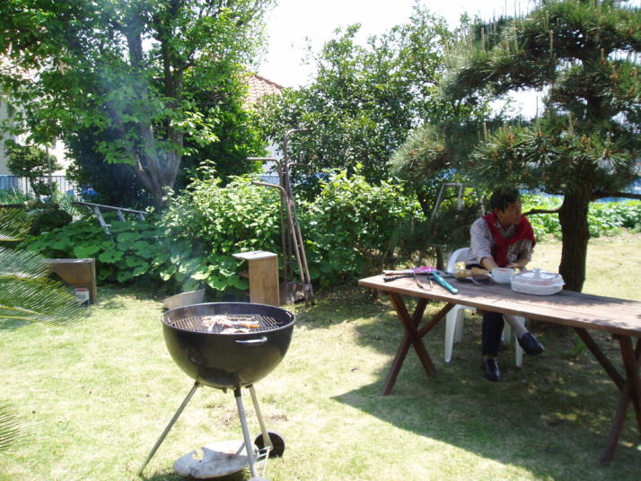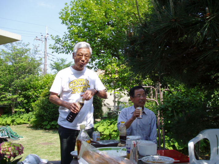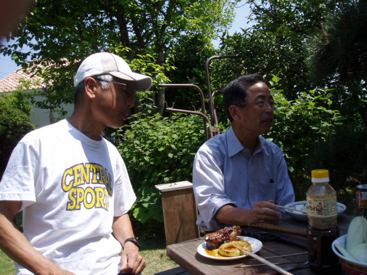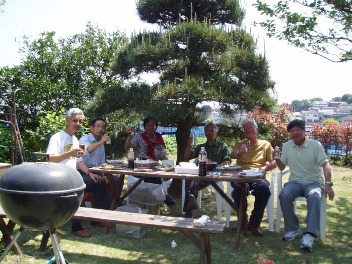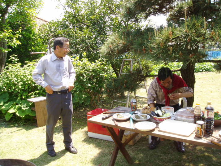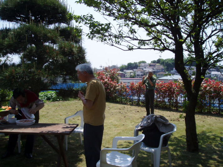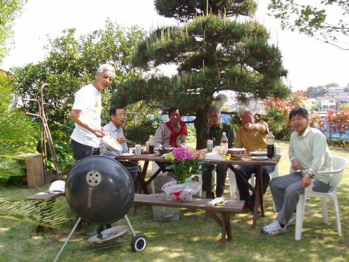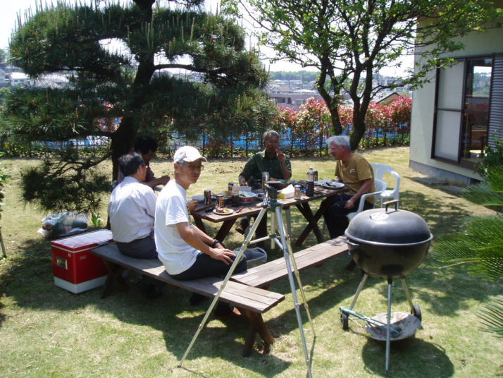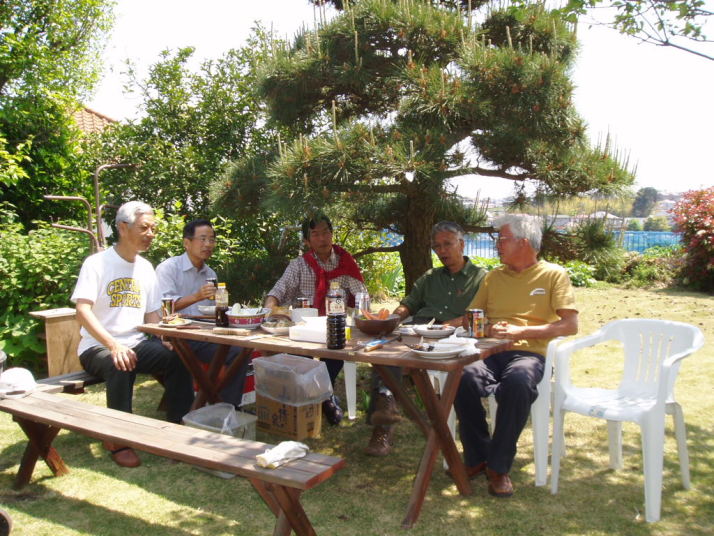2007年5月3日 久本宅での新緑バーベキュー会 見晴らしの良い、高台の広い庭の芝生の上でバーベキューを楽しみました。美味しそうなふきがたくさん茂っていました。 ジャガイモの花はまだ咲いていませんでした。たまねぎはそろそろ収穫時期でした。 参加者:萩原、西山、笹本、久本、山本