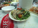 ・メインディシュは、特製久本サラダボール。レタスの上に、キュウリ・トマト・カボチュアの煮つけ、ごぼうサラダ、フキの煮つけ、春菊が