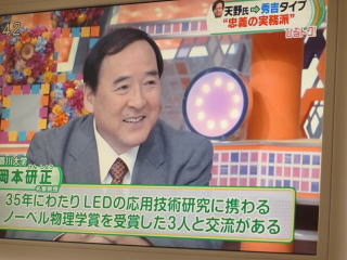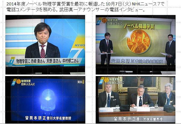 2014年10月9日TBS「ひるおび」に岡本さんが青色LEDのでノーベル賞受賞者を3人 をよく知る、LED応用研究者として出演し、コメントしました。LEDを埋め込んだ杖を (自作)紹介していました。8日のNHKニュースでの電話コメントその他多数出演あり。 日経20141008夕刊での岡本さんのコメント記事pdf |