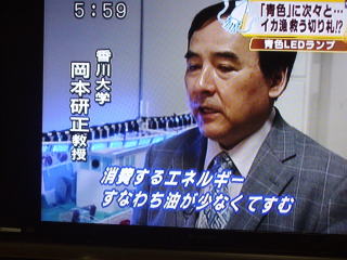 2008年6月18日フジTVで紹介 燃料代高騰でピンチのイカ釣り船の集魚灯 に岡本教授の青色LEDを使う研究成果を取り上げ |