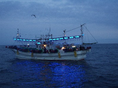 岡本教授の研究成果 青色発光ダイオードを使ったイカつり船 |