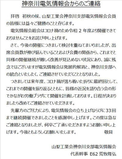電気情報会のホームページ http://www2u.biglobe.ne.jp/~denki-j/ 2023年12月末に解約 ⇒電気情報会アーカイブへ保存 https://u.ymkp.net/denkij1988-2023/ Facebook コミュニティー https://www.facebook.com/Kanagawa.Denki.Jouhoukai/ Facebook グループ https://www.facebook.com/groups/denki.j/ 今後は工業会神奈川支部会員として活動を継続します。 山梨工業会神奈川支部のホームページ https://u.ymkp.net/kanagawa/ |