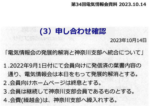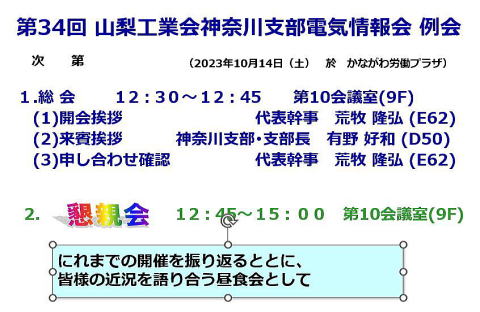 | 34 | 2023年10月14日 | 神奈川支部電気情報会例会(最終回) | 参加者全員 | E62荒牧 | HO6岡村 15人かながわ労働プラザ | |