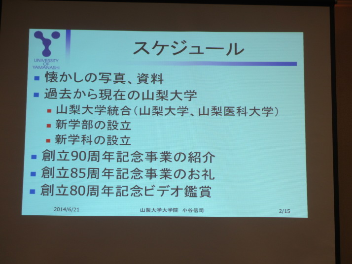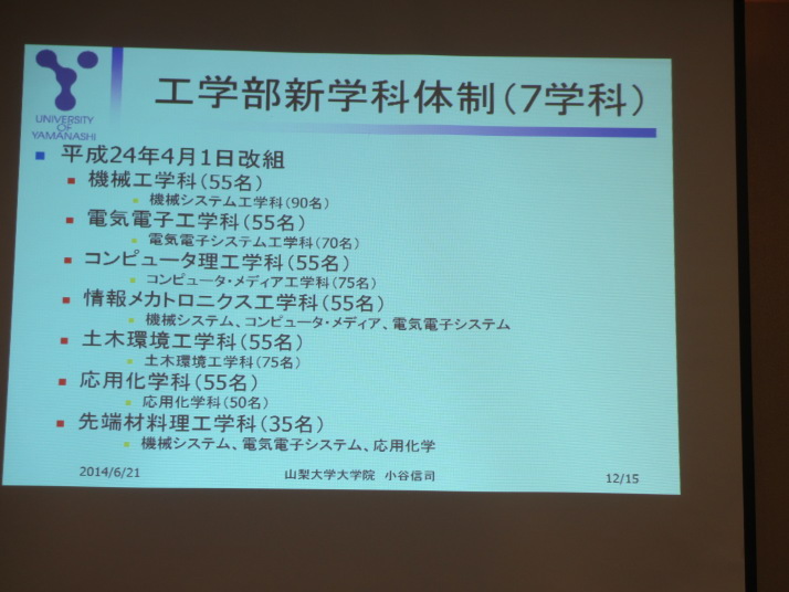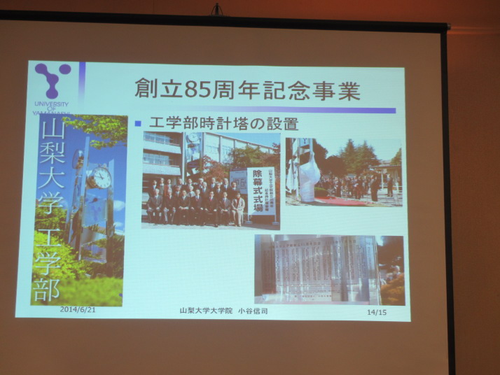1.日時:平成26年6月21日(土 15:00~15:30 支部総会 3F いちょう 15:30~16:50 特別講演 3F いちょう 演題 「山梨大学の近況と生命環境学部の最新トピックス」 (講師)山梨大学生命環境学部部長 生命工学科教授 早川正幸氏 (発酵生産学科昭和52年卒、大学院昭和54年修了) 16:50~17:10 本部報告 山梨工業会常務理事 山梨大学教授小谷信司氏 (計算機科学科昭和63年卒) 17:20~19:20 懇親会 2F 2.場 所: ワークピア横浜 参加者 56名(講師・来賓を含む) 2014工学部紹介冊子.pdf 2014生命環境学部紹介冊子.pdf |